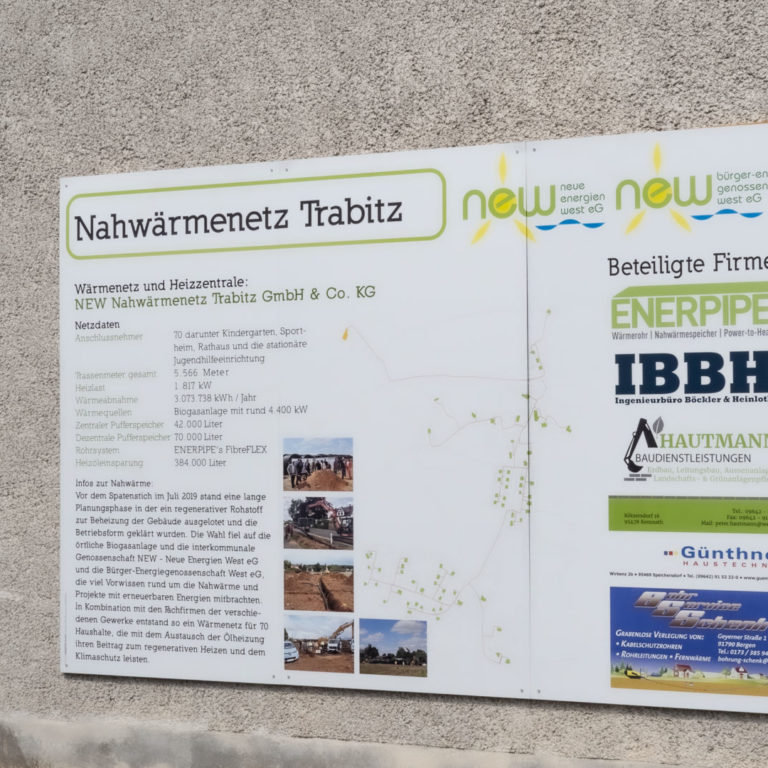 Im Jahr 2018 wurde auf Initiative von Bürgermeisterin Carmen Pepiuk die Errichtung eines Nahwärmenetzes für die Gemeinde Trabitz ins Gespräch gebracht. Schnell kristallisierte sich heraus, dass unsere Bürgerenergiegenossenschaft West eG der ideale Partner für dieses Vorhaben sein wird. Nach zahlreichen Gesprächen haben insgesamt über 60 Trabitzer ihre Wohnhäuser an das Nahwärmenetz der entstanden Nahwärme Trabitz GmbH & Co. KG anschließen lassen. Auch das Rathaus, das Sportheim und der neue Kinderkarten bekommen die Wärme von unserer Biogasanlage. Somit können jährlich ca. 3.500.000 kWh Wärme von der Biogasanlage abgenommen werden.